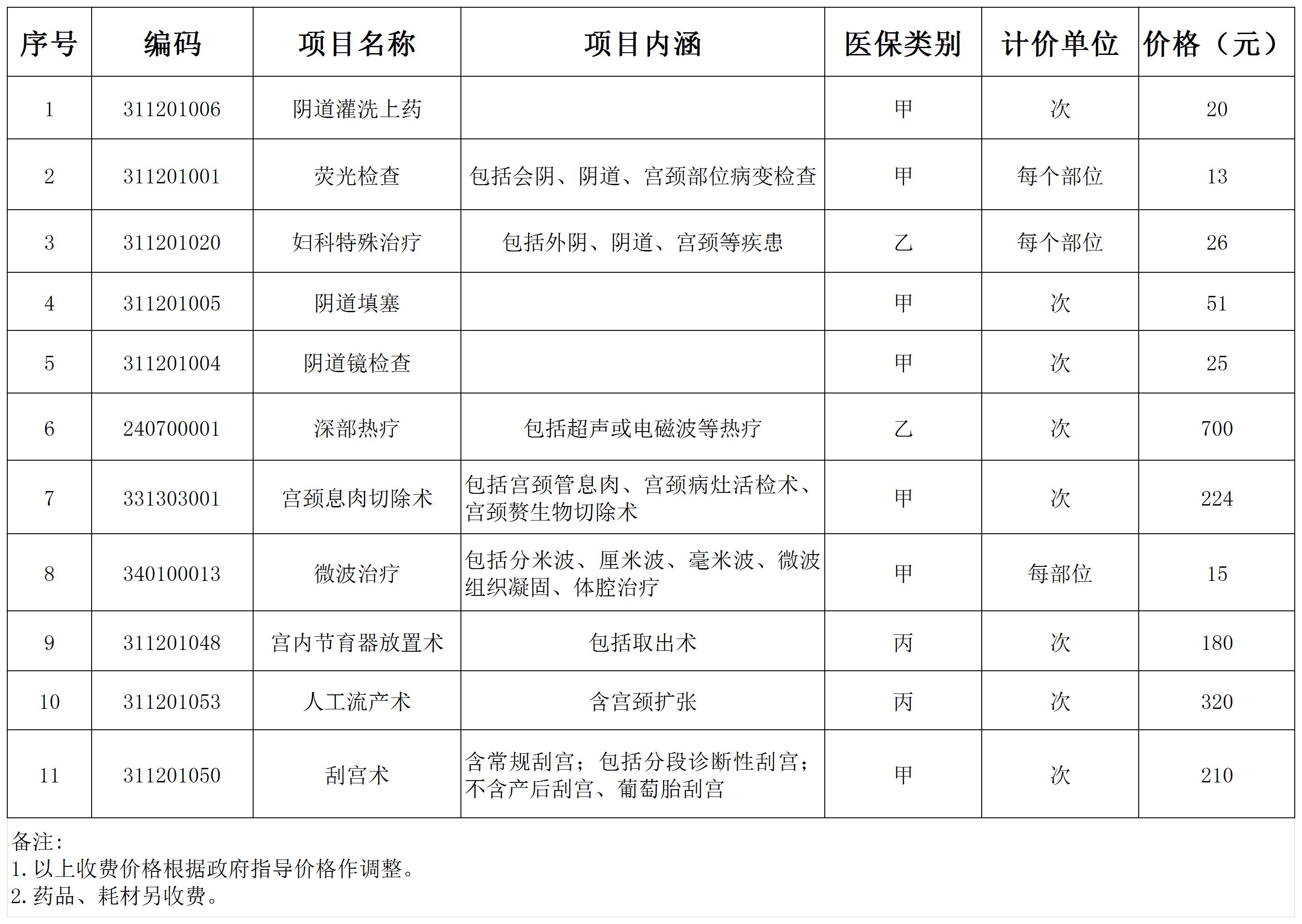 妇科价格公示