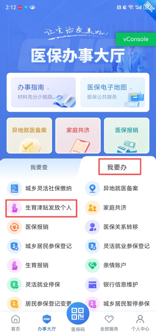 步骤二:点击“我要办”,点击“生育津贴发放个人”
