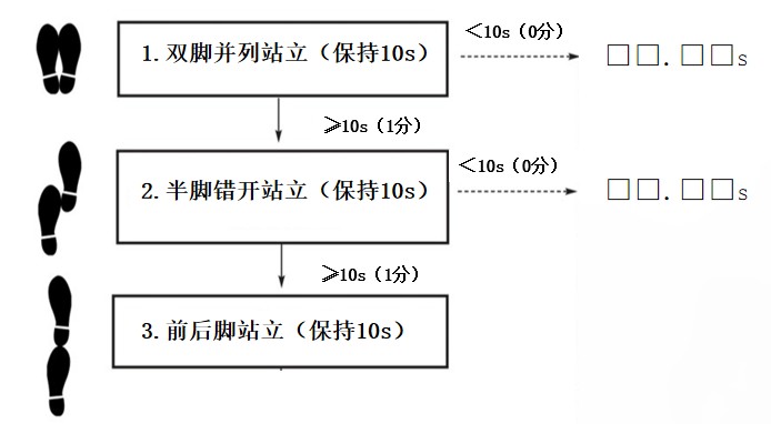 双脚前后一条线站立 | 未尝试、<3.0s | 3.0≤~<10.0s | ≥10.0s | - | - |