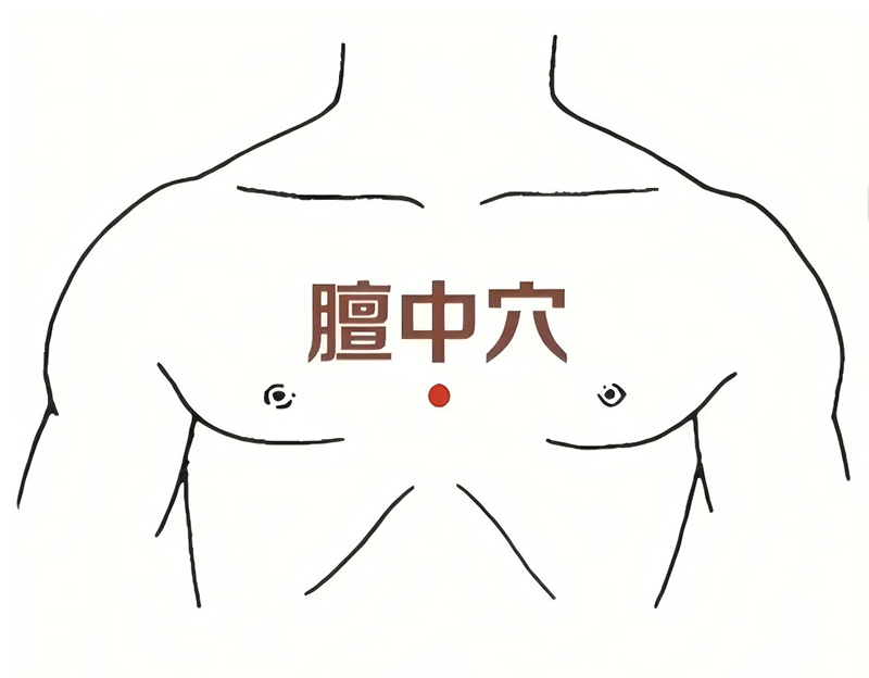 膻中穴位于两侧乳头正中央。以膻中穴为中心,上下左右轻柔按揉60次即可,力度以微酸胀感为宜。