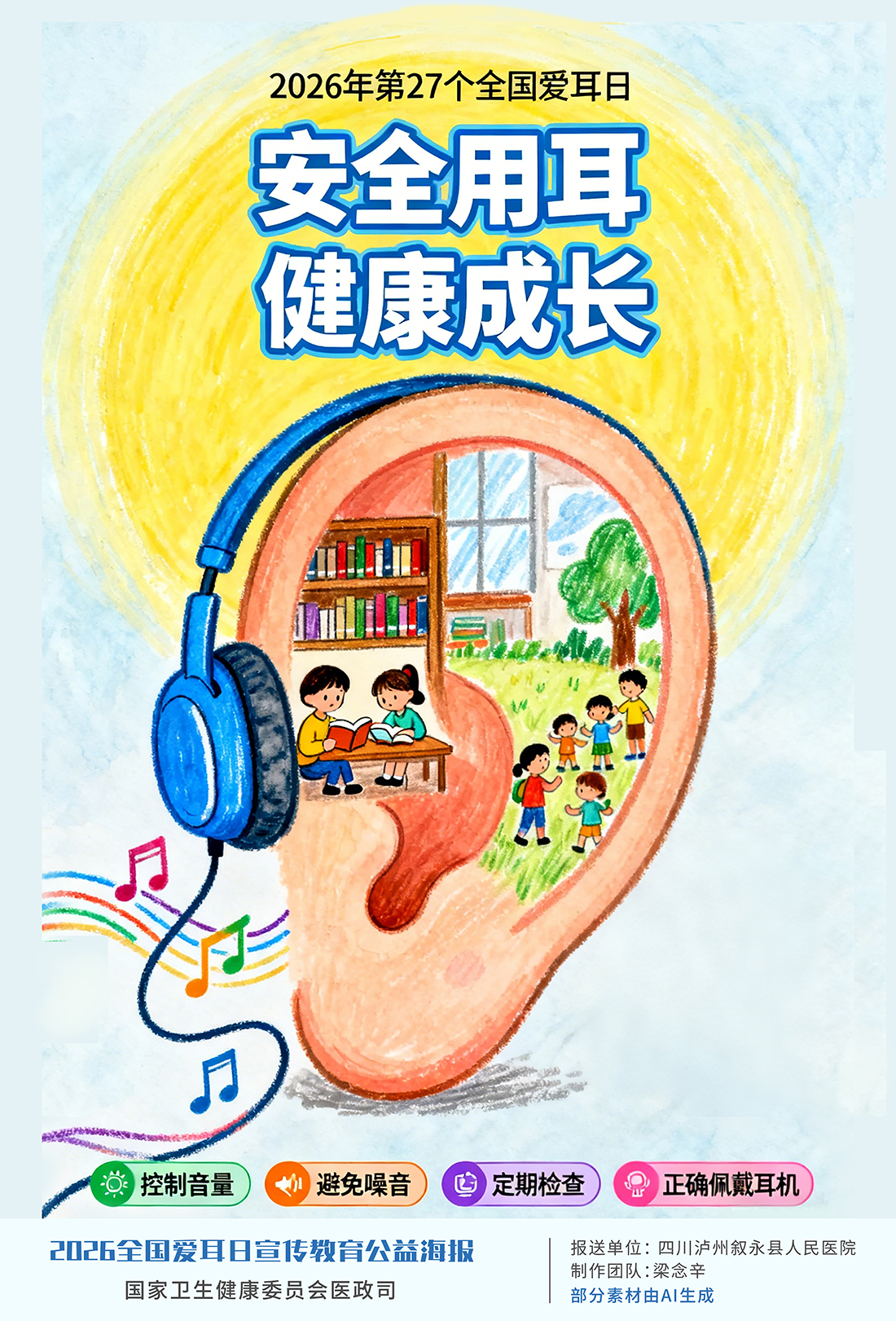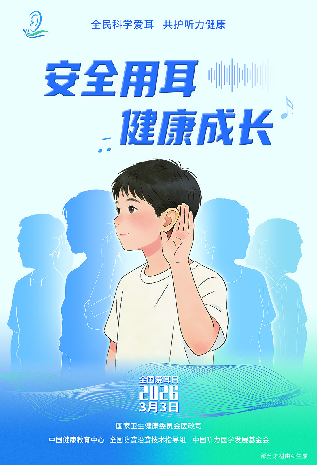2026年3月3日是第27个全国“爱耳日”。今年活动的主题是“全民科学爱耳,共护听力健康——安全用耳、健康成长”。为便于各地开展相关宣传活动,医政司组织制作了公益海报,在国家卫生健康委官网发布,供各地使用。